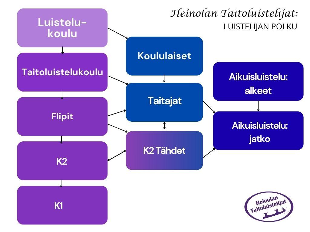 Lisää tietoa eri ryhmistä, niiden ikäsuosituksista, ryhmän tavoitteista, harjoittelun sisällöstä ja valmentajan painottamista asioista löytyy Heinolan Taitoluistelijoiden toimintakäsikirjasta kappaleesta 7.3 Luistelijan polku. Toimintakäsikirjassa käydään sisältö ryhmä kerrallaan läpi.